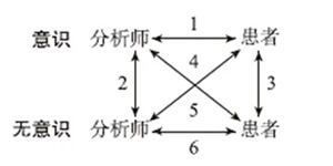 双向箭头表示双向的沟通和关联性。1指的是治疗联盟。2反映了一个事实,即在分析中,分析师既借鉴了自己的无意识来理解他的患者,也将获得使他成为一位受伤的治愈者(wounded healer)的经历。分析师自己的分析会在此发挥影响。3代表患者对自身问题的初始阶段的察知,这些问题被患者的抗拒以及患者对自己人格面具的投入所打断。4和5表示分析关系对双方参与者的无意识生活产生的影响,这是一种人格的混杂,将导致参与者面对可能带来个人变化的对立境况。6表示分析师与患者无意识之间的直接交流。最后一项假设支撑着关于反移情的各种意见(参见下文)。荣格认为,他在炼金术中为原型移情的这个方面找到了恰当而有效的隐喻。