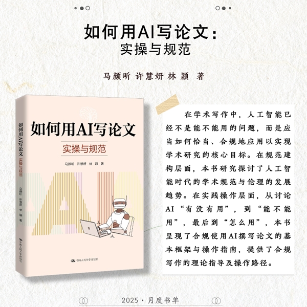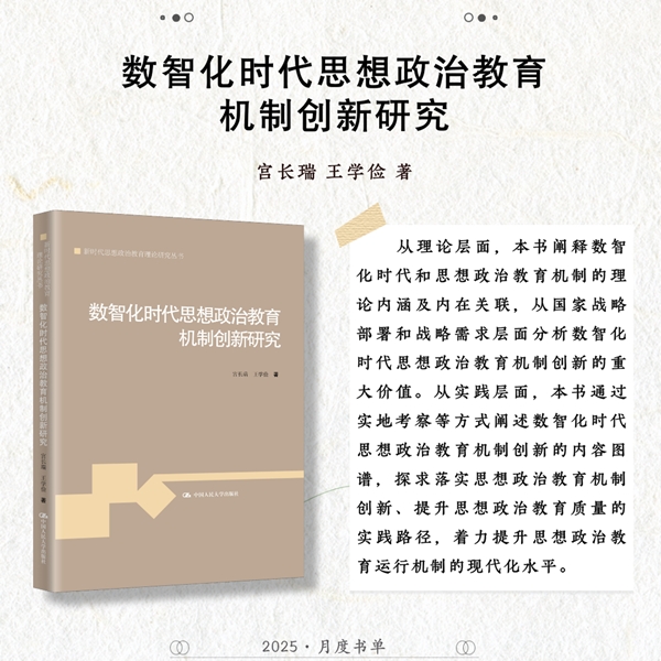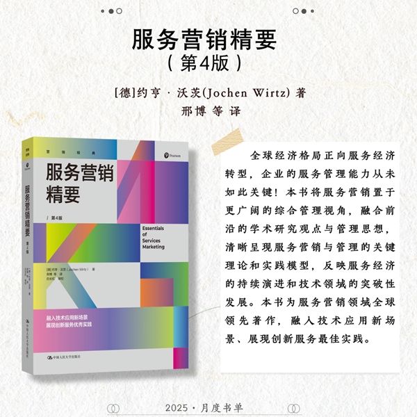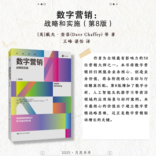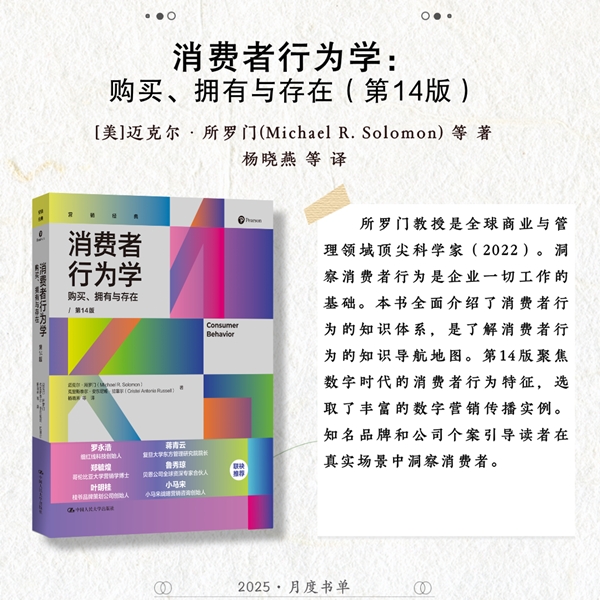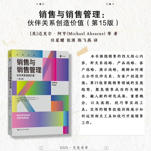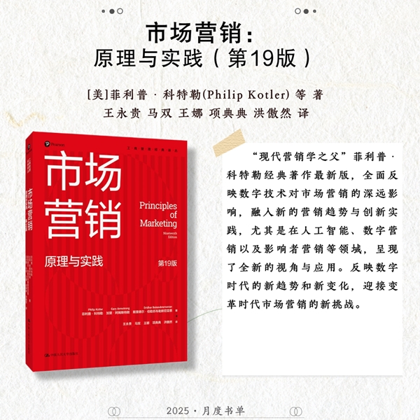 中国人民大学出版社推荐2025年10月新书单,共24种图书,分别为:《读懂中国,关键要读懂中国式现代化》《中国特色社会主义政治经济学的历史性贡献》《数智化时代思想政治教育机制创新研究》《建构中国自主的环境法知识体系》《市场营销:原理与实践(第19版)》《消费者行为学:购买、拥有与存在(第14版)》《销售与销售管理:伙伴关系创造价值(第15版)》《服务营销精要(第4版)》《战略品牌管理:创建、评估和管理品牌资产(第5版)》《数字营销:战略和实施(第8版)》《新时代的阿尔戈英雄:人才流动与创新扩散》《发明与经济增长》《真实数据科学》《国际财务报告准则史》《世界金融简史:关于金融市场的繁荣、恐慌与进程》《社会与政治运动讲义(第三版)》《左宗棠传奇》《在城在乡:清代江南市镇与农村关系的空间透视》《如何用AI写论文:实操与规范》《中学语文名篇解读》《卡尔夫沙盘游戏治疗(第6版)》《拉开人生差距的关键能力》《600号画廊:“梵高”们的内心世界》《设计关键对话》。