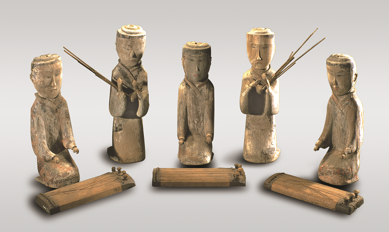 吹竽木俑分别高36cm和8cm,鼓瑟俑均高32.5cm,西汉,出土于马王堆一号汉墓,湖南博物院藏