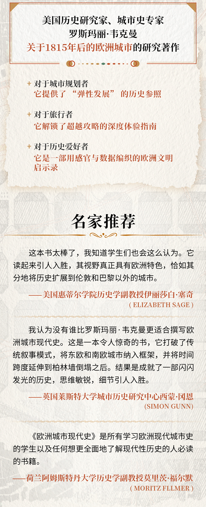本书讲述了1815年到现在的欧洲城市史,将整个欧洲的城市历程交织在一起,探寻城市景观的发展模式。作者聚焦于城市持续与变迁模式的社会和文化转变,以及向现代城市社会的过渡过程,以探究欧洲城市特色。韦克曼提出了一种含有文化和后殖民研究的概念以及城市地理的跨学科方法,介绍了整个欧洲大陆的城市社会,并讨论了从伦敦到热那亚的多个城市和城市类型,使读者可以更好地理解过去两个世纪以来欧洲的现代化轨迹。