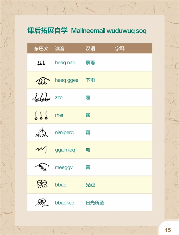 该书精选约200个基础常用东巴象形文字,按照“天地”“人家”“生活”三大主题进行单元划分,共计12课。每课将东巴象形文字、汉语、纳西拼音三者对照,通过识字、单句、纳西拼音、词语拼读、书写、知识拓展等模块,带领读者理解每个东巴象形文字的构成、读音、书写规范及应用场景。基于语言学理论,内容的编写从单字到文化内涵逐层深化,同时引入“文字结构拆解”“纳西拼音对照”等原创教学方法,降低学习门槛,提高吸引力。
