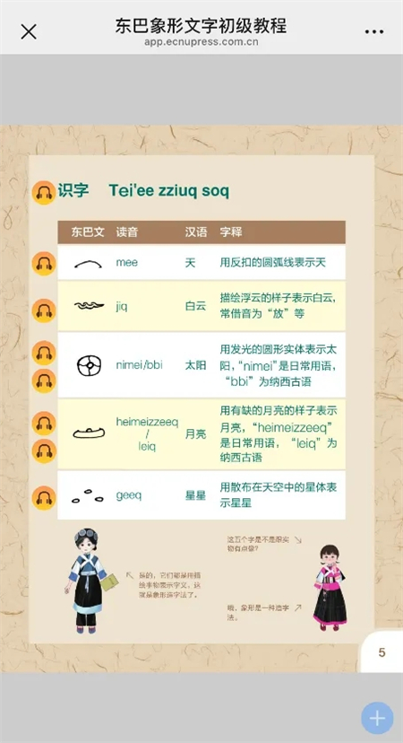 作为原始文字形态的瑰宝,东巴象形文字的传承却面临着三大挑战:高度依赖本民族传统信仰文化,与现代教育脱节;缺乏系统化教材,年轻一代兴趣不足;学术研究资源分散,普及难度大。面对以上难题,华东师范大学出版社联合华东师范大学、丽江师范学院、丽江市东巴文化研究院,以“纸电同步+学术原创”为核心,打造国内首个东巴象形文字教材丛书系列,通过融合出版的方式推动非遗文化活态传承。