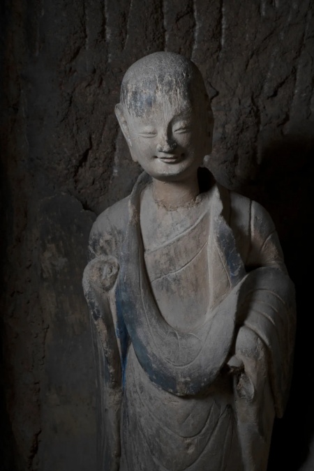 第133窟的小沙弥,头微微右偏,细颈溜肩,笑容天真稚气,羞涩中透着喜悦,像刚听了句悄悄话而忍不住笑出声。工匠用极简的造型表现出无限希望与质朴纯洁。确实,看他一眼,嘴角就会不自觉地上扬。