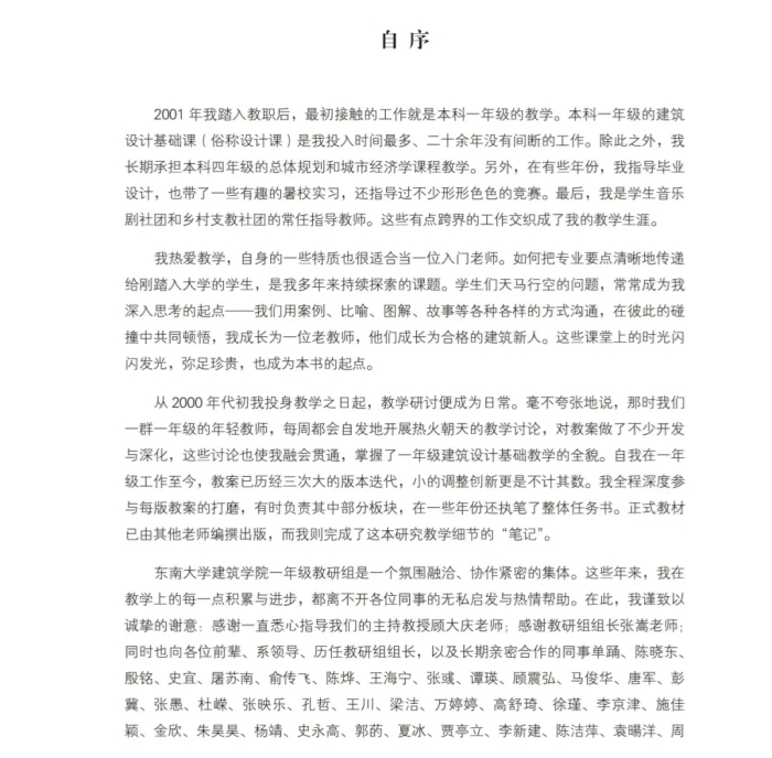 本书是作者基于东南大学建筑学院20余年本科一年级建筑设计基础教学实践的笔记体著作。全书立足该院3版经典教案的迭代脉络,聚焦10~15人小组教学场景,以“技能”“形式”“设计”“城市”“思考” 五大板块为框架,收录100个教学小议题。书中既梳理了教案从单一训练到深度探讨抽象空间的演变轨迹,也详细记录了课堂实操细节:既包含观察方法、图纸模型审美等恒定核心内容,也涵盖空间表达技巧、专业概念阐释等逐年打磨的教学要点,同时呈现师生互动片段与学生实践成果。