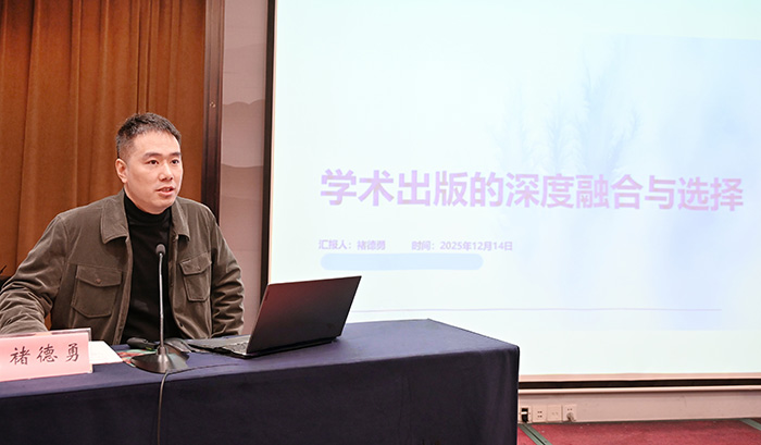 褚德勇以《学术出版的深度融合与选择》为题,分析了高校出版社的学术出版特点,提出四条学术融合出版路径:一是内容与技术的融合;二是平台化运营与服务延伸;三是数据驱动与智能传播;四是跨界合作与资源整合。