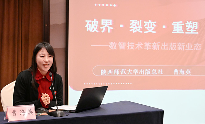 曹海英以《破界・裂变・重塑——数智技术革新出版新业态》为题,结合陕西师范大学出版总社出版实践做经验分享,强调出版人应秉持工匠精神,以深厚文化修养赋予作品思想深度,助力出版事业高质量发展。