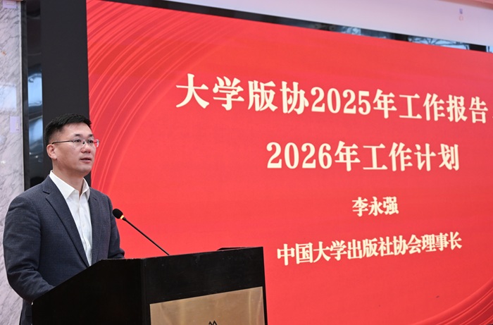 李永强从五方面总结了大学版协2025年工作情况:一是深化党建引领,筑牢行业发展政治根基;二是聚焦主责主业,搭建高质量行业交流平台;三是推动AI赋能大学出版,提升人员素质和研究水平;四是完善服务体系,增强行业凝聚力与自律水平;五是谋划长远发展,编制“十五五”规划建议稿。关于2026年工作,一是认真贯彻落实党的二十届四中全会精神,以高质量党建引领协会及大学出版高质量发展;二是组织大学出版社集体组团参加书博会等国内大型书展;三是组织推荐“大学出版好书”;四是组织编写大学版协40年发展史;五是依托中国高校教材图书网,组织开展大学出版数据统计与填报工作;六是举办编辑业务培训班;七是组织协调各工作委员会根据大学版协年度工作计划,积极开展相关活动。