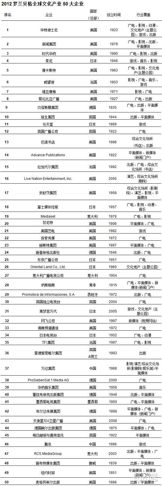 去年底,罗兰贝格发布了一个《全球文化产业50大企业排名》,中国的万达和腾讯榜上有名,虽然万达已经旗帜鲜明的定位自身为文化企业,但实际上其商业地产的华丽外衣根本还未脱去,而腾讯则是因其游戏的收入而被勉强划入文化产业行列。