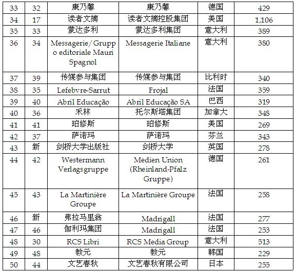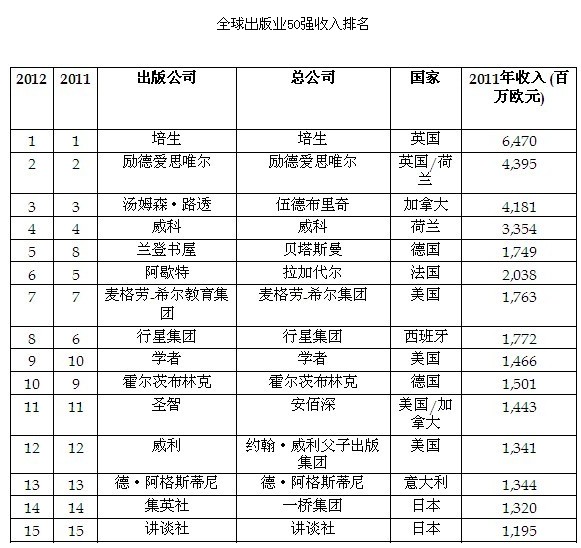 这一变化表明建基于新兴市场的出版商不断涌现且收益呈增长态势,比如本次榜单的新成员:中国出版集团和凤凰出版传媒集团,另外还有2010年首次出现在榜单上的巴西Abril Educação。