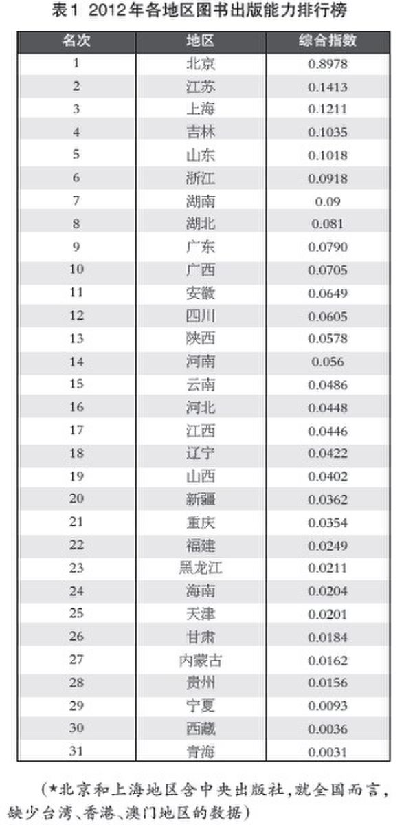 根据出版能力指数,我国图书出版可以划分为五大地域板块,即第一板块,北京;第二板块,江苏、上海;第三板块,吉林、山东、浙江、湖南、湖北、广东、广西;第四板块,安徽、四川、陕西、河南、云南、河北、江西、辽宁、山西、新疆、重庆、福建、黑龙江、海南、天津、甘肃、内蒙古、贵州;其余为第五板块。第一板块和第二板块提供了全国图书出版能力的47.13%。