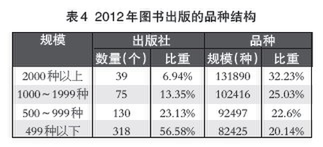 全国有374家出版社的总品种数量实现增长,2家出版社维持不变,其余出版社的出版品种有所下降。有39家出版社的品种规模超过了2000种,比2011年多了8家。1000种以上品种规模的出版社为114家(含2000种以上品种规模的出版社),比2009年多了22家。这114家出版社占出版社总数的比重为19.66%,其品种规模总量占全国图书出版品种的57.26%,而出书规模在500种以下的318家出版社,数量超全国出版机构半数,品种资源占全国总品种的20.14%(见表4)。