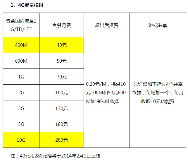 此次推出的4G资费方案的一个显著优点是可以支持多用户分享功能:主卡客户定一个大流量包,可以支持2-5个用户分享套餐内流量,能较好的满足一云多屏或者家庭共享的需求。
