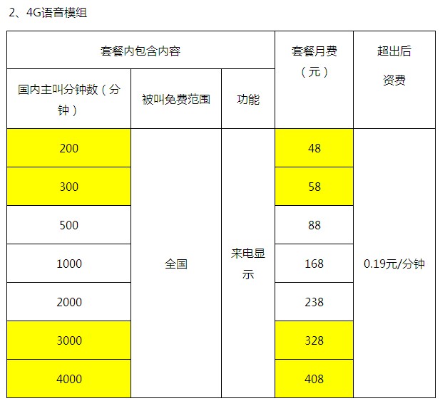 附:中国移动4G全网统一资费方案