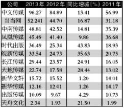 表1显示,与2012年相比,12家上市书企的营业收入座次并未发生根本性变化,从绝对值来看中文传媒、中南传媒、凤凰传媒、当当网和新华文轩依旧占据了前5名,当中仅有时代出版因37.72%的增幅赶超了长江传媒位居第7位。个中原因,时代出版迈出了全媒体互动、多产业融合、大产业链拓展和跨地区、跨行业、跨所有制发展的大步伐,差异化竞争,充分享受模式创新所带来的“红利”,切实在机制、布局、人才、创新、融合和“走出去”等方面实现新突破,走出一条较快并可持续发展的新路子。而从营业收入增幅大小来看,紧随时代出版之后的大地传媒、皖新传媒、当当网和长江传媒,其营业收入增幅均超过了20%,分别为27.02%、26.15%、21.80%和20.70%。