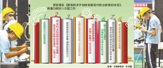鲁昕强调,需要重点做好八项工作:一是抓紧制定出台配套政策,重点抓好关系学生成长成才成功、就业创业创新等系统性制度建设;二是推进现代职业教育体系建设,打通职业教育学生从中职、专科、本科到研究生的上升通道,搭建人人皆可成才的“立交桥”;三是提高教育教学质量,增强职业教育对社会、对广大青年的吸引力;四是正确处理政府与市场、与社会的关系,用改革的办法推动职业教育发展;五是实施产教融合、校企合作的国家制度体系建设;六是加强职业教育治理体系和治理能力现代化建设;七是督促各级党委和政府把加快发展现代职业教育摆在更加突出的位置;八是营造职业教育发展的良好氛围。