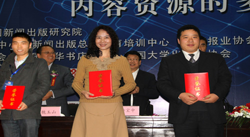中国大学出版社协会副秘书长、中国高校教材图书网主任岳凤翔(前中)代表网站领奖