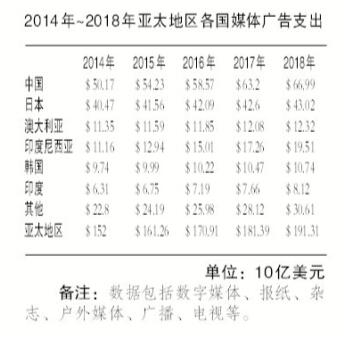 根据International Monetary Fund的调查,未来两年亚太地区仍是全球经济增长最快的地区。虽然亚太地区各国经济增长预期不同,但是整个地区的广告支出前景乐观。eMarketer预测2014年亚太地区媒体广告支出将达1520亿美元,年增长6.3%,占全球广告支出的27.9%,落后于北美(35.6%)排在第二位。