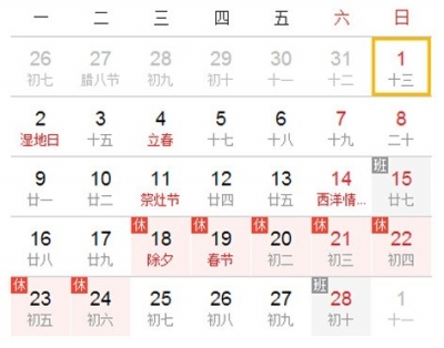 19日,春节(农历正月初一)