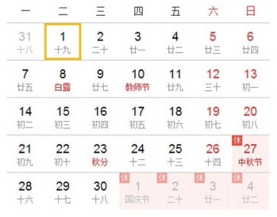 27日,中秋节(农历八月十五)