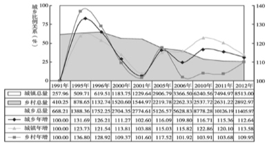 该报告将全国城镇与乡村文化消费总量绝对值转换为图形面积直观比例,同时展示出1991年以来城乡之间的增长互动关系,二者增长指数曲线之间的第三条曲线即为城乡综合增长指数。(详见图1)