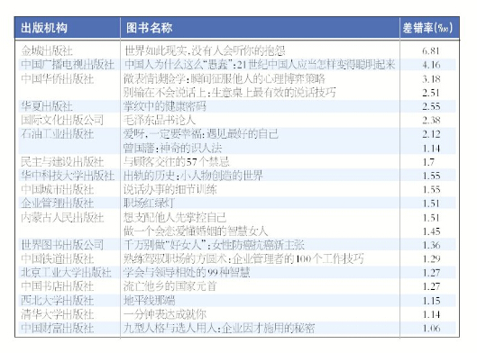 据总局出版产品质量监督检测中心党组书记、副主任孙宝林通报,有18家出版单位的21种图书编校质量为不合格。其中,金城出版社的《世界如此现实,没有人会听你的抱怨》差错率最高,达6.81 。其次是中国广播电视出版社的《中国人为什么这么“愚蠢”:21世纪中国人应当怎样变得聪明起来》,差错率达到4.16 ;中国华侨出版社的《微表情读脸学:瞬间征服他人的心理博弈策略》差错率达到3.18 。