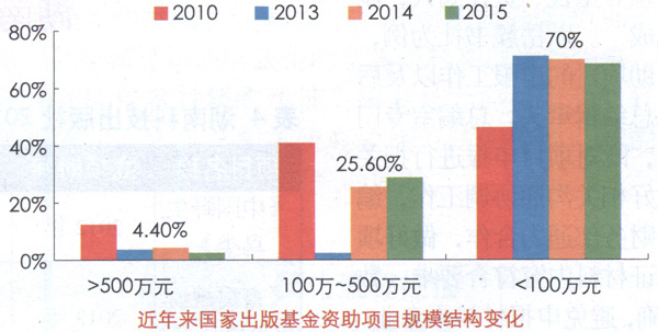从申报方面来看,2015年国家出版基金资助项目每家出版单位依旧限报2个项目,获得2015年度申报名额奖励的出版单位按规定每家可增加申报一个项目。但2015年的申报不再按照“项目申请资助金额分级申报”。这项改革意味着国家出版基金在项目资助方面打破了资助规模的限制,而更加客观、公正地评选优秀的出版物作为基金资助对象。