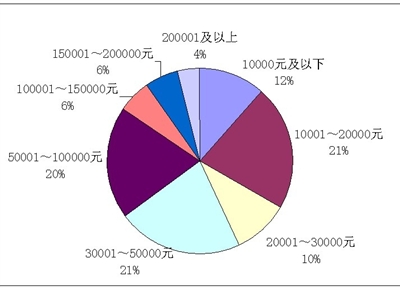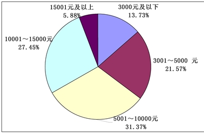 具体到月收入方面,在3000元及以下的比例为13.73%,3001~5000元的占到21.57%,5001~10000元的占到31.37%,10001~15000元的占到27.45%,15001元以及上的占到5.88%。