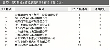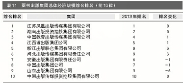 以2014年12月31日收盘价计算,31家出版发行和印刷上市公司股市流通市值合计2601.8亿元,较2013年同期增加860.9亿元,增长49.5%;前10位降序依次为中南出版传媒集团股份有限公司、北京康得新复合材料股份有限公司、江苏凤凰出版传媒股份有限公司、浙报传媒集团股份有限公司、中文天地出版传媒股份有限公司、华闻传媒投资集团股份有限公司、安徽新华传媒股份有限公司、上海新华传媒股份有限公司、深圳劲嘉彩印集团股份有限公司和时代出版传媒股份有限公司。其中,书报刊出版公司6家,发行公司2家,印刷公司2家,全部在中国内地上市。