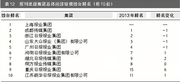 全国共出版报纸1912种,较2013年降低0.2%;总印数463.9亿份,降低3.8%;总印张1922.3亿印张,降低8.4%;定价总金额443.7亿元,增长0.8%。报纸出版实现营业收入697.8亿元,降低10.2%;利润总额76.4亿元,降低12.8%。平均期印数超过100万份的报纸减少3种;46家报刊出版集团主营业务收入与利润总额分别降低1.0%与16.0%,报业集团中有17家营业利润出现亏损,较2013年增加2家。