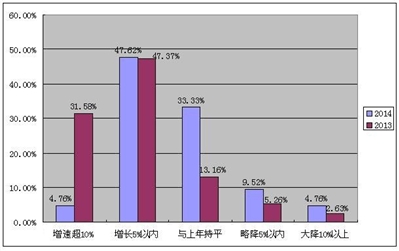 调查结果显示,相对2013年,有4.76%的受访国际出版商表示其2014年图书销售业务“快速增长,涨幅超过10%”,2014年该选项占比为31.58%;47.62%的受访国际出版商认为自己2014年图书销售业务“稳中有升,增长5%以内”,稍稍高于去年该选项47.37%的占比;认为出版销售业务表现“与2013年基本持平”的国际出版商占33.33%,去年该选项仅为13.16%;而“略有下降,降幅5%以内”、“明显下降,降幅10%以上”则分别占9.52%、4.76%,分别高出去年4.26个百分点、2.13个百分点。调查统计结果显示,同比增长的合计为52.38%,表明仅半数的国际出版商的出版业务在2014年实现了较大增长,相比去年占比78.95%下降了26.57个百分点。对此,有国际出版商表示,“尽管2014年没有2013年强,但截至目前,2015年的情况同比上一年发展得更好”。(见图表)