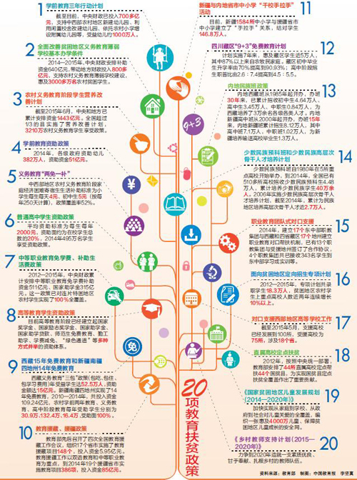 在全面改善贫困地区义务教育薄弱学校基本办学条件的政策规划中,中央财政安排补助资金640亿元,带动地方财政投入800多亿元,惠及3000多万名农村贫困学生。