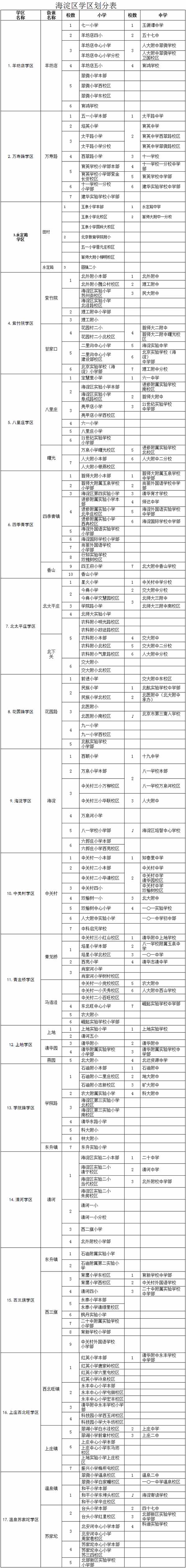 记者从海淀区教委了解到,海淀区将区域内所有中小学划分为17个学区(见图表),依据的是5个原则:街镇行政区划界限重合、学区间规模大致相当、按照最新的布局调整情况划分、年级部制校区与本校所在学区一致、校数依据独立法人资格计算。学区的优质教育资源分布合理、相对均衡。