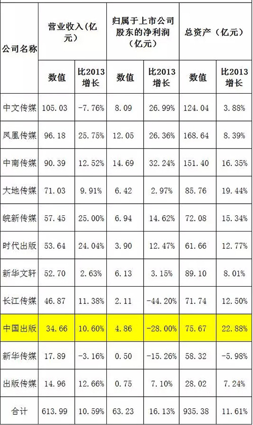 我们将中国出版的主要财务数据与出版业主要上市公司做了对比分析,结果如下: