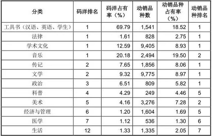 除此之外,中国出版在核心业务上也具有较强竞争力,旗下出版机构在众多分子产品领域处于行业领先地位。如其在2014年工具书类市场的占有率就十分可观,为69.79%,这样的成绩恐怕商务印书馆功不可没。此外,在法律、学术文化、音乐等类别的市场份额占有率也排名第一,分别为1.61%、12.59%、20.18%,而公司占有率排名相对靠后的是生活类,占有率为1.33%。