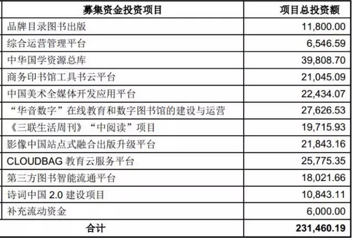 招股书中披露了中国出版上市后募集资金投资计划,并对每一个投资项目都进行了市场情况和项目必要性分析,详细介绍了各个项目的板块组成以及项目经济效益估算。投资项目几乎全部为数字出版、数字平台建设项目。募集资金投资项目及规模如下: