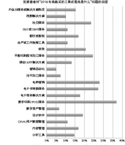 2016年出版界将投资于哪些新技术?哪些新产品和平台会带来收入增长?美国《图书业杂志》网站(bookbusinessmag.com)2015年12月对139位出版高管做了问卷调查,发现如下几大发展趋势: 2016年将有更多的出版商采用数字印刷技术。36.7%的受调查者在回答“2016年将购买的工具或服务是什么”时,均表示将投入资金使用数字印刷或按需印刷服务,选择这种方式的出版商居首位,而在2015年,出版商购买的工具或服务类型位居第一的是电子书转换。
