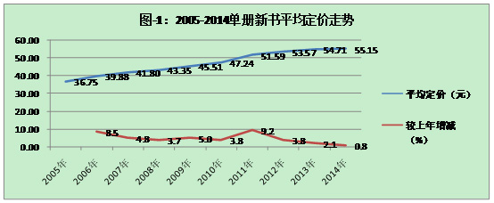 统计显示,统计期内单册新书(不区分装帧形式)平均定价以0.8%至9.2%不等的涨幅逐年上涨,2005年平均定价36.75元,2014年平均定价55.15元,涨额约19元,年均涨幅接近5%。期间2006及2011的涨幅明显高于其他年份,较上年增长幅度分别为8.5%和9.2%,详见图-1。