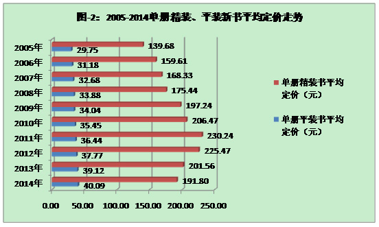 图书的装帧形式对定价有着显著影响。统计显示,平装新书单册定价从2005年的均价29.75元逐渐拉升至2014年的40.09元,年均增幅3.4%;精装(含古籍线装、蝶装、锦盒装、经折装等)新书单册定价一直处于高位,从2005年的139.68元增至2012年的225.47元后,2013、2014价格有所回落,年均增幅7.4%,高出平装书4个百分点。详见图-2。