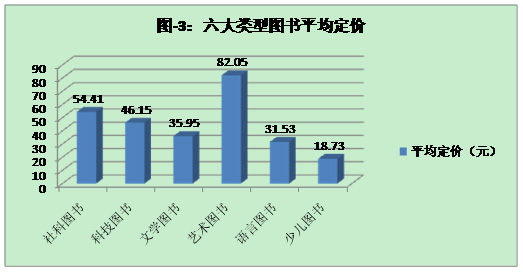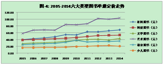 以市场上常见的社科、科技、文学、艺术、语言、少儿等分类对图书定价进行统计,结果显示:2005-2014十年间,艺术图书以82.05元的平均定价高居榜首,社科图书、科技图书以54.41元、46.15元的平均定价位列第二、三名,文学图书、语言图书紧随其后,少儿图书以18.73元的平均定价位居最末。