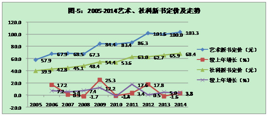 2005-2014,艺术新书逐年平均定价为:57.9、67.9、68.5、67.3、84.4、83.4、86.3、101.6、100.0、103.3,上涨额45.4元,年均涨幅7.1%;社科新书逐年平均定价为:39.9、42.8、45.1、48.4、54.4、53.6、63.0、62.7、65.9、68.4,上涨额28.5元,年均涨幅6.4%。
