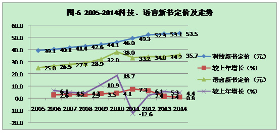 2005-2014,科技新书逐年平均定价为:39.1、40.1、41.4、42.6、44.1、46.0、49.3、52.3、53.1、53.5,上涨额14.4元,年均涨幅3.5%;语言新书逐年平均定价为:25.0、26.5、27.7、28.9、32.0、38.0、33.2、34.0、34.2、35.7,上涨额10.7元,年均涨幅4.9%。