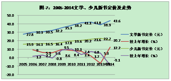 2005-2014,文学新书逐年平均定价为27.8、30.3、30.5、32.2、35.3、38.2、41.1、41.8、38.9、43.6,上涨额15.8元,年均涨幅5.9%;少儿新书逐年平均定价为15.9、16.1、16.5、16.4、17.8、19.6、20.2、21.6、22.7、20.7,上涨额4.8元,年均涨幅3.1%。