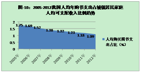 据《中国出版年鉴》等有关资料,近年来我国居民人均年购书册数未见明显增长,基本维持在4-5册左右,本文以5册为基数测算了2005-2012人均年购书支出占城镇居民人均可支配收入比例情况(国家统计局相关数据以统一口径统计至2012年,故比对截至2012年),可见:虽然图书定价逐年上涨,但居民购书费用支出占我国城镇居民人均可支配收入比重从2005年的1.75%逐渐下跌,至2012年已降为1.09%。
