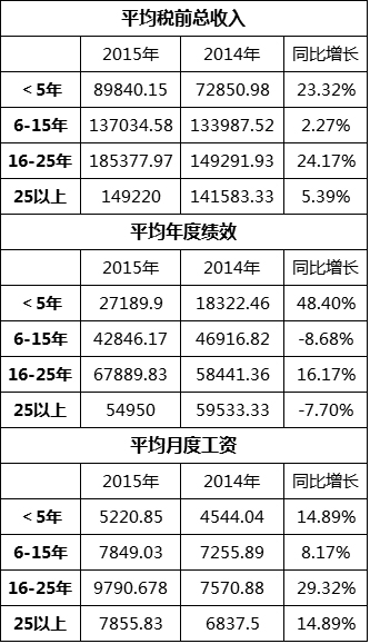 与2014年的调查结果相比,2015年不同从业年限出版从业人员之间的收入差距要更为明显。其中,从业16-25年的收入水平最高,2015年平均税前总收入为185377.97 元,比2014年同样从业年限的人员增长了24.17%;从业25年以上的次之,2015年平均税前总收入为149220.00 元,比2014年同样从业年限的人员增长了5.39%;从业6-15年的位居第三,2015年平均税前总收入为137034.58元,比2014年同样从业年限的人员增长了2.27%;从业5年以下的最低,2015年平均税前总收入为89840.15元,比2014年同样从业年限的人员增长了23.32%。