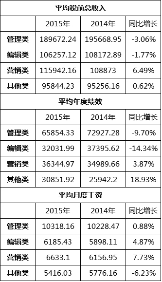 从收入变化情况看,2015年仅有营销类和其他类岗位平均收入水平出现上涨,编辑类和管理类岗位平均收入水平均意外下降。2015年,营销类岗位的平均税前总收入为115942.16元,同比上涨6.49%;其他类岗位为95844.23元,同比微涨0.62%;编辑类岗位为106257.12元,同比下降1.77%;管理类岗位为189672.24元,同比下降3.06%。分析编辑类岗位和管理类岗位的收入构成可以发现,两类岗位的平均月度工资收入与2014年相比其实均有所增长,全年收入出现负增长主要是由于平均年度绩效下降造成的。四类岗位的收入排序依然是管理类、营销类、编辑类、其他类,与2014年一致。