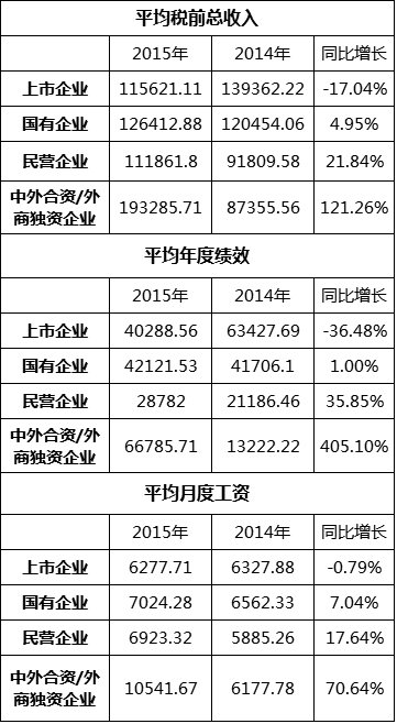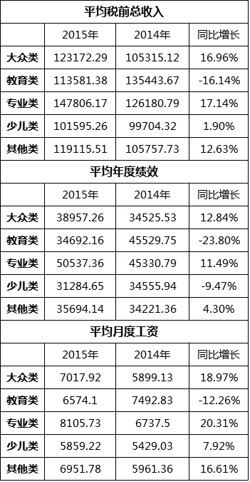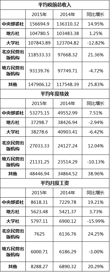 在这六类出版机构中,2015年平均税前总收入最高的是在中央部委社从业的人员,达到156694.90元,同比增长14.95%;在其他类出版机构从业的人员收入同比增幅达到25.83%,达到147906.12元,跃居第二位;在北京民营出版机构从业的人员收入同比增幅也达到21.36%,达到118533.33元,从去年的垫底跃居到第三位。随后依次为:大学社从业人员,平均税前总收入为107843.89元,同比下降12.82%;地方社从业人员,平均税前总收入为104780.50元,同比微增1.25%;地方民营出版机构,平均税前总收入为93139.76元,同比下降4.72%。