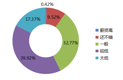 调查结果显示,出版从业人员对2015年薪酬的满意度比2014年略有提高。其中认为自己“薪酬高”的占比0.42%,而上年度这一比例为零;认为自己收入水平“还不错”的占比9.52%,比上年度提高1.36个百分点;认为自己收入水平“一般”的占比32.77%,比上年度减少1.63个百分点;认为自己收入水平较低的占比39.92%,比上年度提高了1.62个百分点;认为自己收入水平太低的占比17.37%,比上年度减少了1.78个百分点。