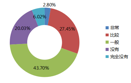 对行业前景信心度的提高,有利于增强从业人员的职业安全感。本次调查显示,在反馈有效问卷的出版从业人员中,“非常”有职业安全感的占比为2.80%,微增0.32个百分点;“比较”有安全感的占比达到27.45%,比上年度提高3.51个百分点;安全感“一般”的占比为43.70%,比上年度减少2.75个百分点;“没有”安全感的占比为20.03%,比上年度减少2.31个百分点;“完全没有”安全感的占比较上年度有所增加,为6.02%。