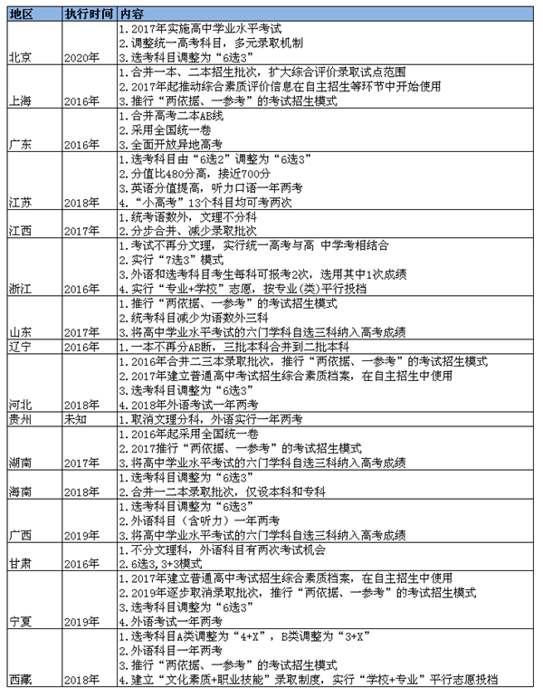 据记者初步统计,全国已有16省份先后出台了本地区高考改革方案,分别为北京、上海、广东、江苏、江西、浙江、山东、辽宁、河北、贵州、湖南、海南、广西、甘肃、宁夏、西藏。此外,安徽、福建、四川将于今年公布本省高考改革方案。通过梳理不难发现,改革招生批次和科目设置是多省份改革的重点。
