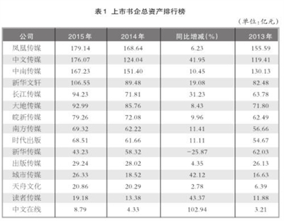 据统计,2015年15家上市书企的资产规模合计为1180.93亿元,同比增长14.66%(见表1)。其中,突破百亿资产规模的有凤凰传媒、中文传媒、中南传媒和新华文轩4家,分别为179.14亿元、176.07亿元、167.23亿元、106.55亿元;新华文轩为首次突破百亿资产规模,中文传媒座次反超中南传媒位居第二,而这4家的资产总规模占到15家上市书企总规模的一半以上,达53.26%。资产规模超过50亿元的阵营成员依次为:长江传媒94.23亿元、大地传媒92.99亿元、皖新传媒79.26亿元、南方传媒69.32亿元、时代出版68.51亿元。而读者传媒和中文在线资产规模均低于20亿元,分别为19.18亿元、8.79亿元。从资产规模增速来看,共有6家超过平均增长率,中文在线以同比102.94%的增速遥遥领先;同比增长率超过40%的有3家,分别为读者传媒、城市传媒和中文传媒;而除皖新传媒、大地传媒、凤凰传媒、出版传媒、天舟文化分别呈个位数增长,新华传媒再度负增长并高达25.87%外,其他均有两位数以上的增长率。